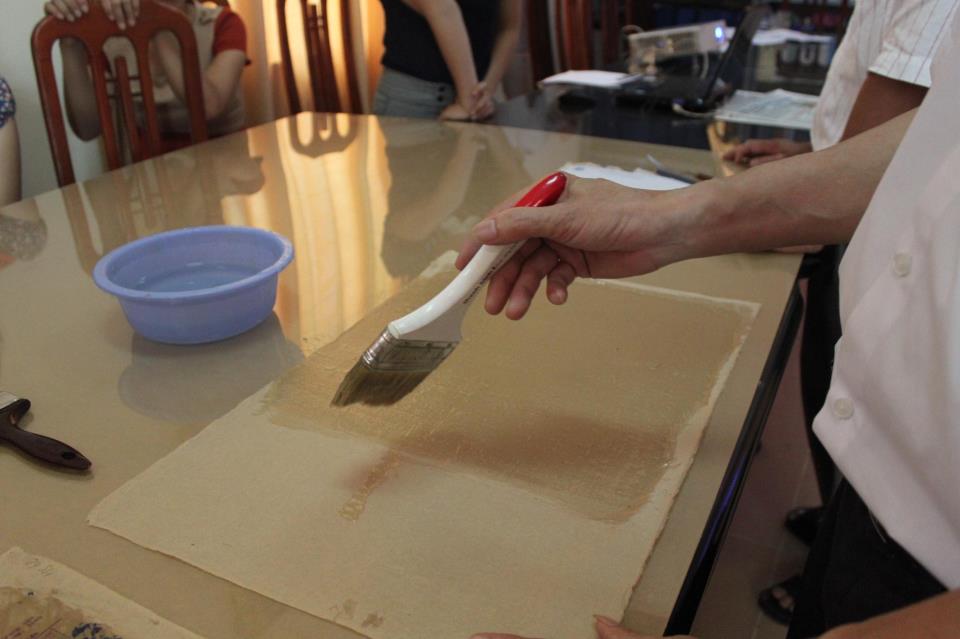 Một số hình ảnh viên chức thuộc Trung tâm Lưu trữ lịch sử thực hành các kỹ năng, kỹ thuật về nghiệp vụ bồi nền tài liệu lưu trữ nền giấy bằng phương pháp thủ công